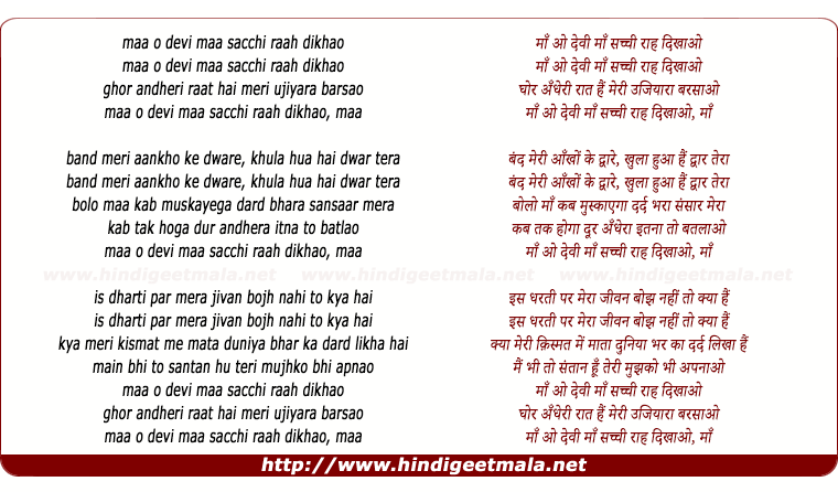 Lyrics of Maa O Devee Maa Sachchee Raah Dikhaao - माँ ओ देवी माँ सच्ची राह दिखाओ