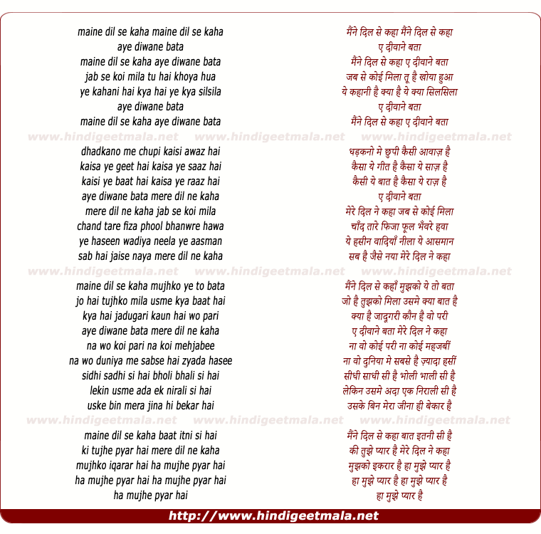Lyrics of Maine Dil Se Kaha Ae Diwane Bata - मैंने दिल से कहा मैंने दिल से कहाmaine dil se kaha maine dil se kaha