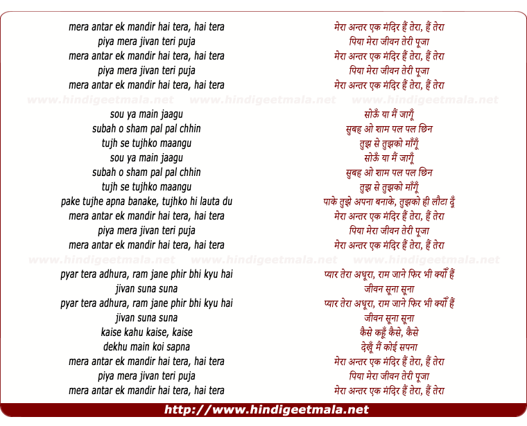 Lyrics of Mera Antar Ek Mandir Hai Tera - मेरा अन्तर एक मंदिर हैं तेरा