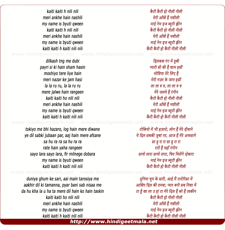 Lyrics of Meri Ankhe Hai Nashili - मेरी आँखें हैं नशीलीkaiti kaiti h nili nili