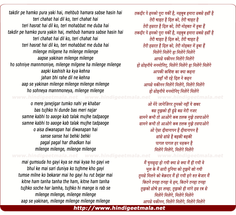 Lyrics of Milenge Milenge (2) - मिलेंगे मिलेंगेtakdir pe hamko pura yaki hai