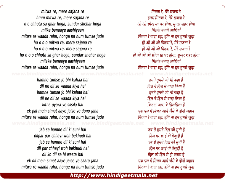 Comments for lyrics of song "Mitwa Re, Mere Sajana Re"