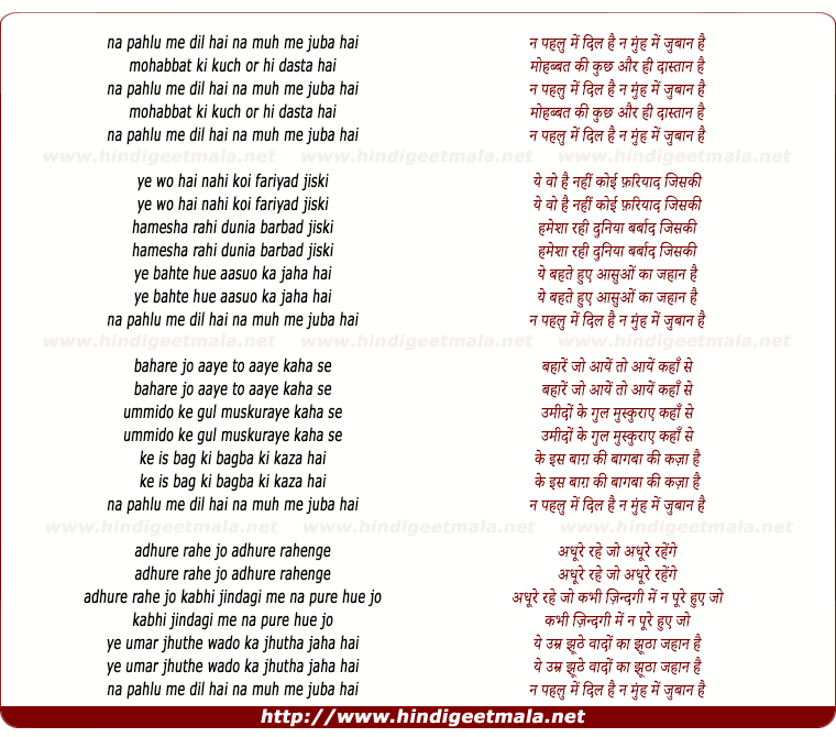 Lyrics of Na Pehlu Me Dil Hai Na Muh Me Juban Hai - ना पहलु में दिल है ना मुंह में जुबान है