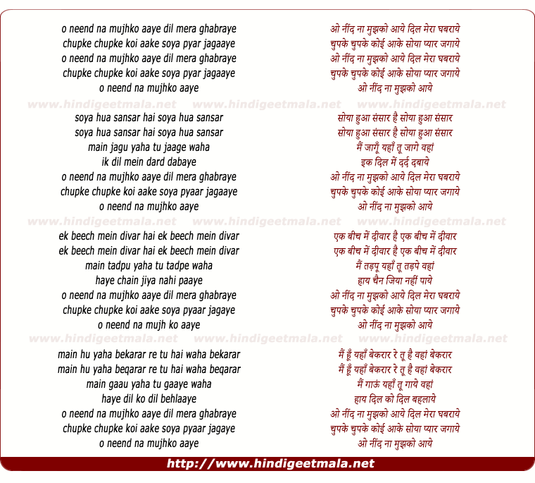 Lyrics of Neend Naa Mujhko Aaye - नींद ना मुझको आये