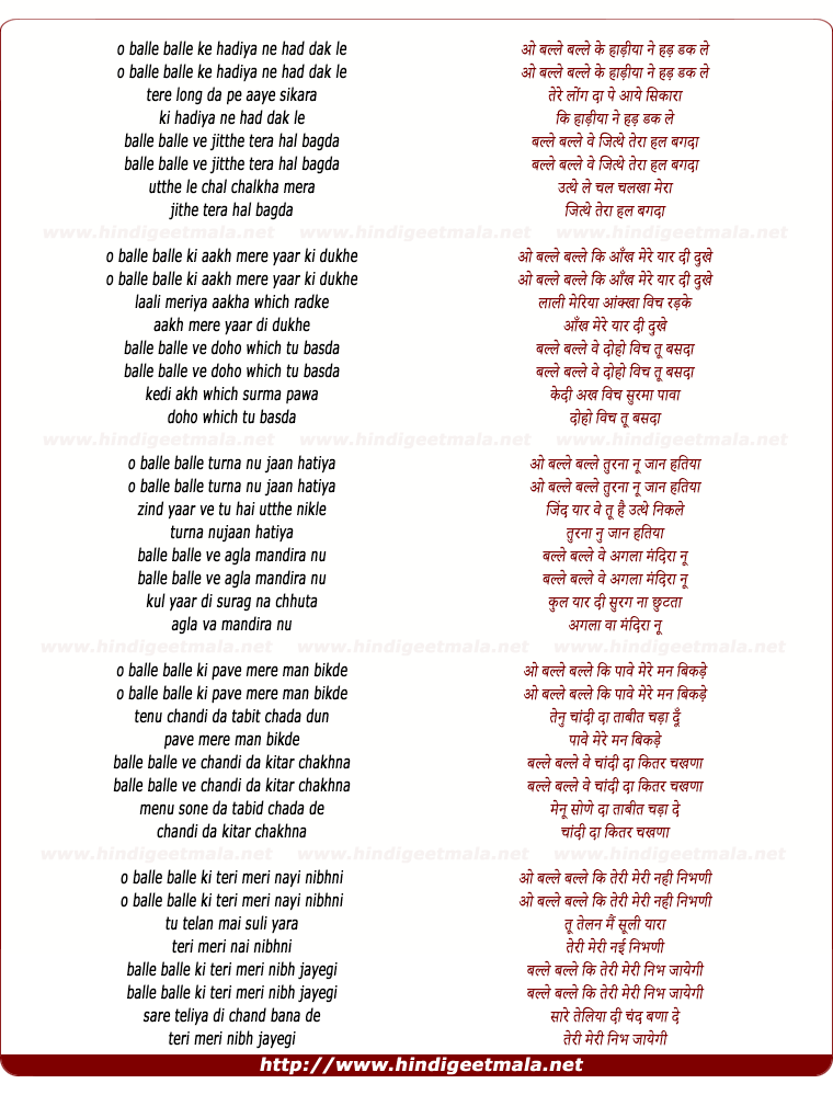 Lyrics of O Bale Bale Ke Harya De Boliyan) - ओ बल्ले बल्ले के हाड़ीया ने हड़ डक ले