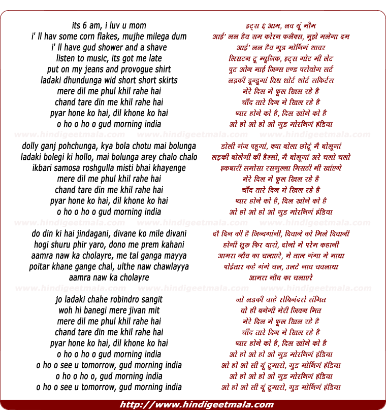 Lyrics of O Good Morning India, Mere Dil Me Phul Khil Rahe Hai - ओ गुड़ मोर्निंग इंडिया, मेरे दिल में फूल खिल रहे है