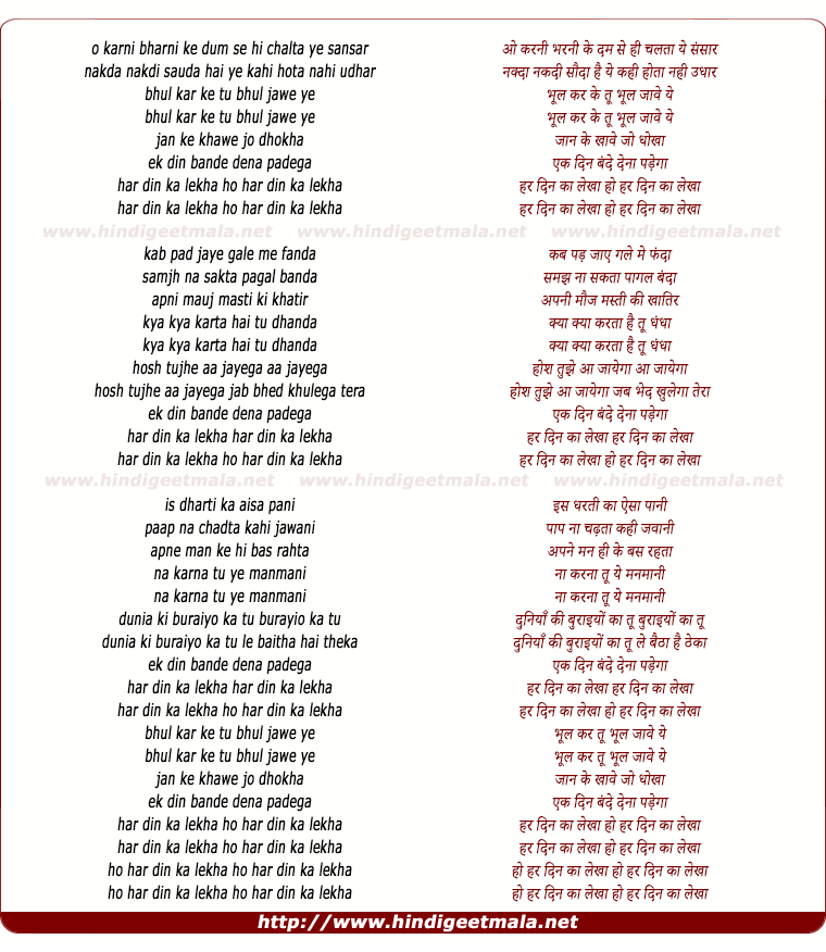 Lyrics of O Karni Bharni Ke Dum Se Hi Chalta Ye Sansar - ओ करनी भरनी के दम से ही चलता ये संसारo karni bharni ke dum se hi chalta ye sansar