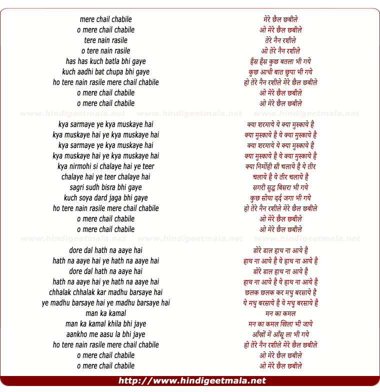 Lyrics of O Mere Chail Chabili Tere Nain Rasile - मेरे छैल छबीलेmere chail chabile