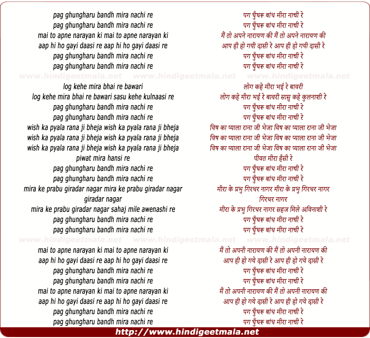 Lyrics of Pag Ghungharu Bandh Meera Nachi Re - पग घुँघरू बांध मीरा नाची रेpag ghungharu bandh mira nachi re