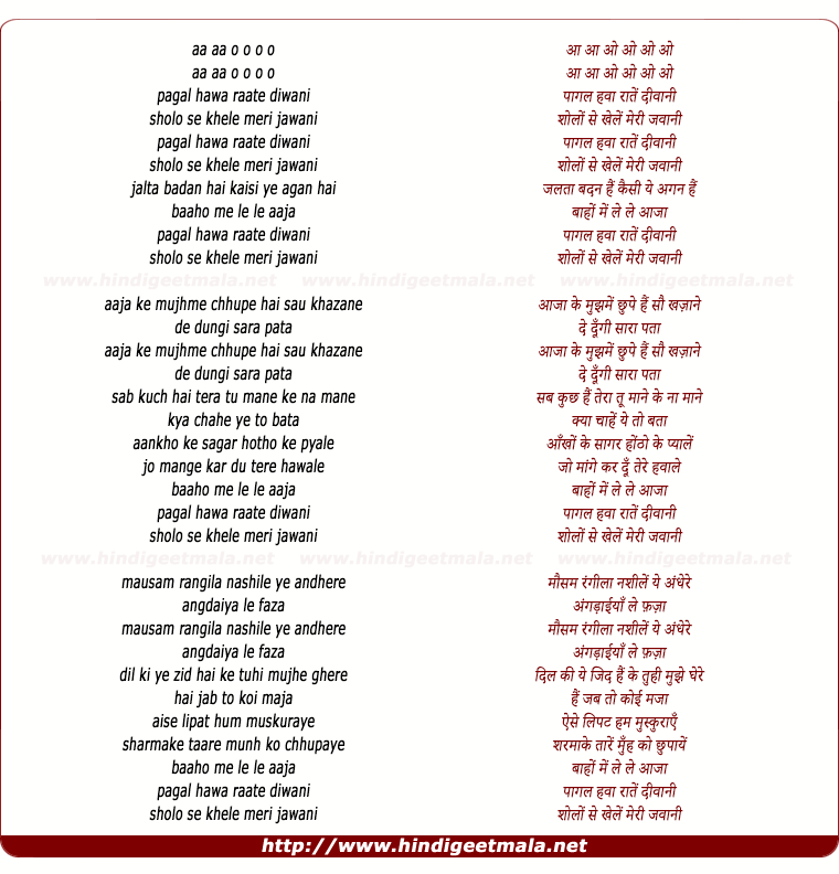 Lyrics of Pagal Hawa Raate Diwani - पागल हवा राते दीवानी aa aa o o o o