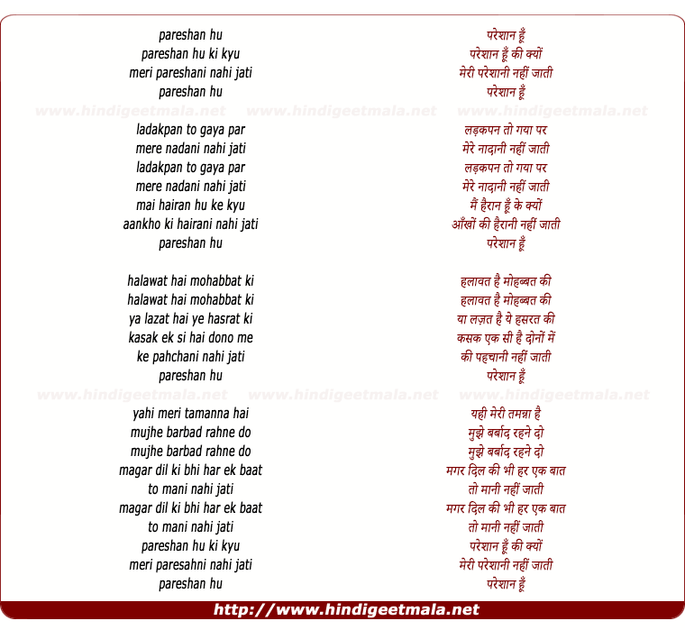 Lyrics of Pareshan Hu Ki Kyu Meri Pareshani - परेशान हूँ कि क्यों मेरी परेशानी