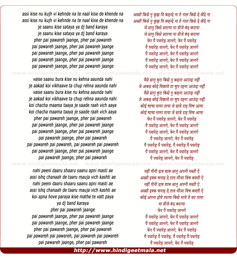 Lyrics of Pher Pai Pawareh Jaange - अस्सी किसे नु कुझ वि कहन्दे ना ते नाल किसे दे खेंदे ना