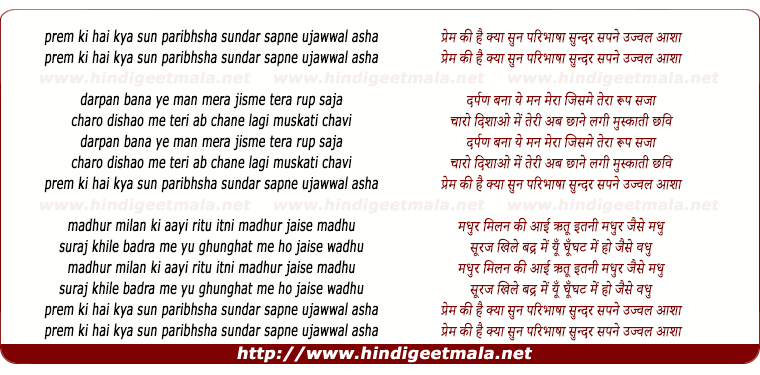 Lyrics of Prem Ki Hai Kya Sun Paribhasha Sundar Sapne Ujwal Asha - प्रेम की है क्या सुन परिभाषा सुन्दर सपने उज्वल आशा