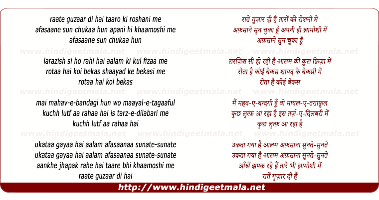 Lyrics of Raaten Guzaar Di Hain Taaron Ki Roshani Men - रातें गुज़ार दी हैं तारों की रोशनी मेंraate guzaar di hai taaro ki roshani me