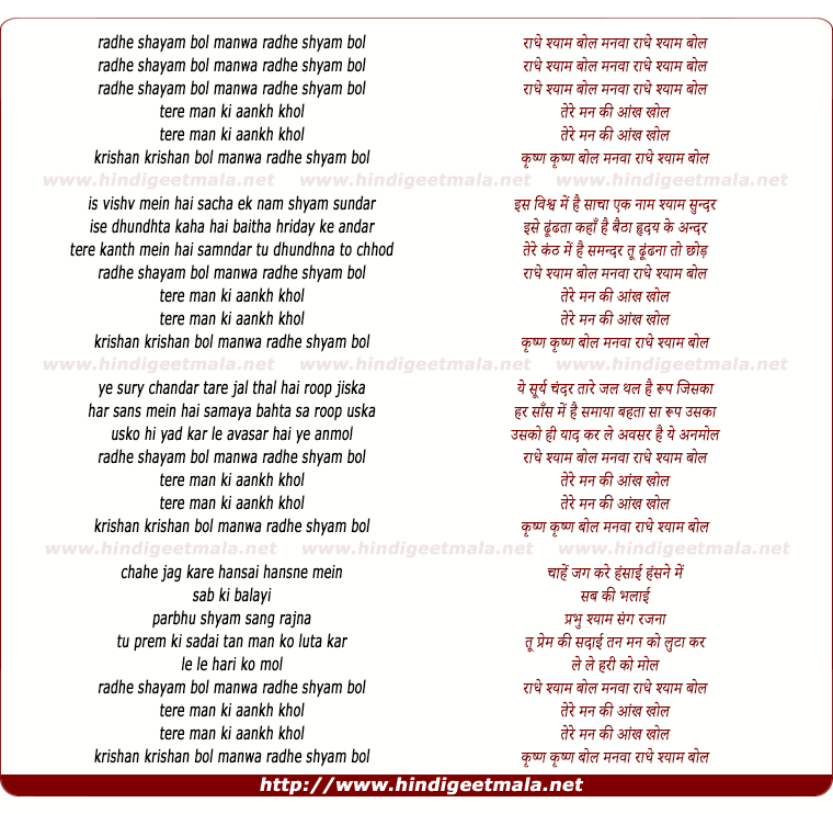 Lyrics of Radhe Shyam Gaaye Ja - राधे श्याम बोल मनवा राधे श्याम बोल
