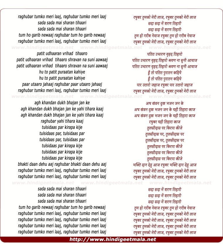 Lyrics of Raghubar Tumko Meri Laaj, Sadaa Sadaa Main Sharan Tihaari - रघुबर तुमको मेरी लाज, सदा सदा मैं शरण तिहारी