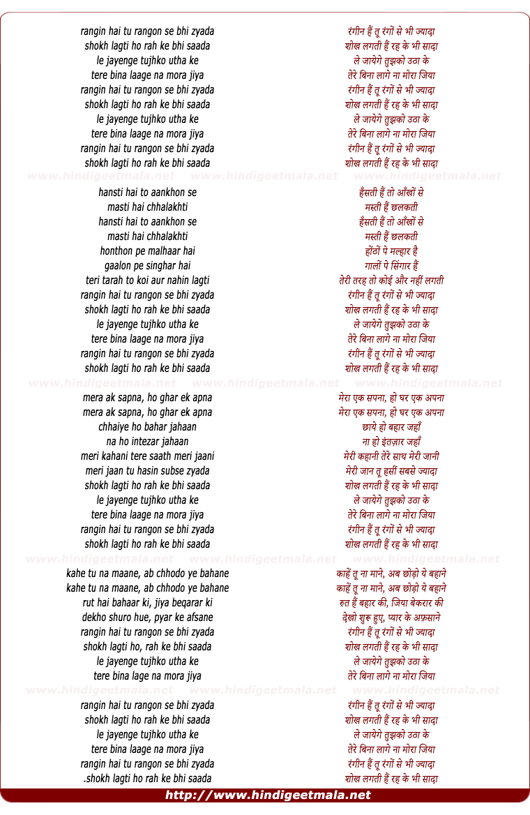 Lyrics of Rangeen - रंगीन हैं तू रंगों से भी ज्यादा