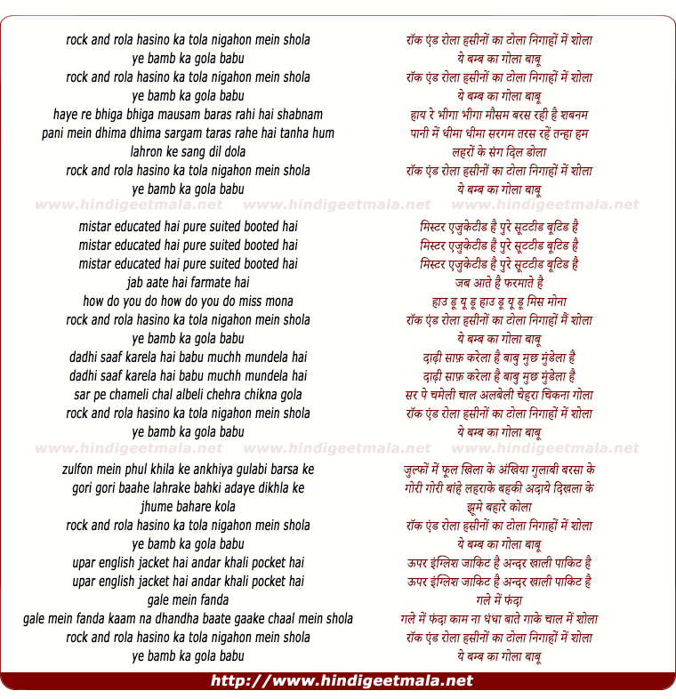 Lyrics of Rock & Rola (Male) - रॉक एंड रोला हसीनों का टोला निगाहों में शोलाrock and rola hasino ka tola nigahon mein shola