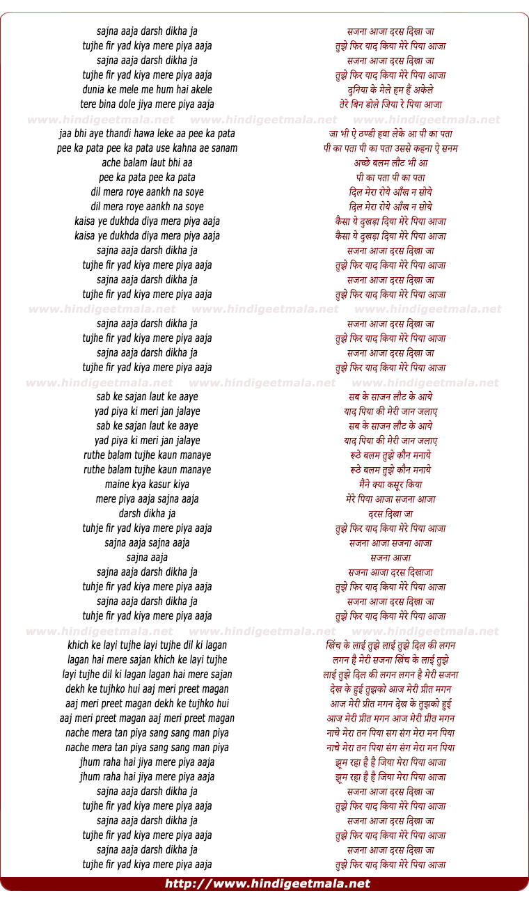 Lyrics of Sajna Aaja Darsh Dikha Ja Tujhe Fir Yad Kiya - सजना आजा दर्श दिखा जा तुझे फिर याद किया