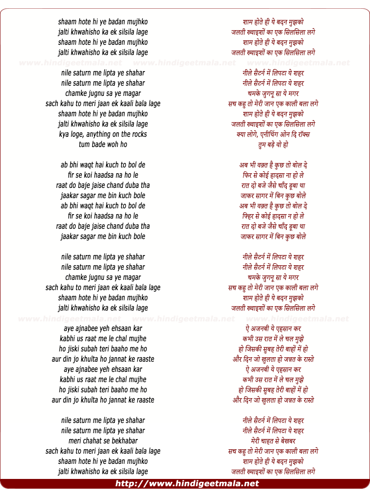 Lyrics of Shaam Hote Hi - शाम होते ही ये बदन मुझको