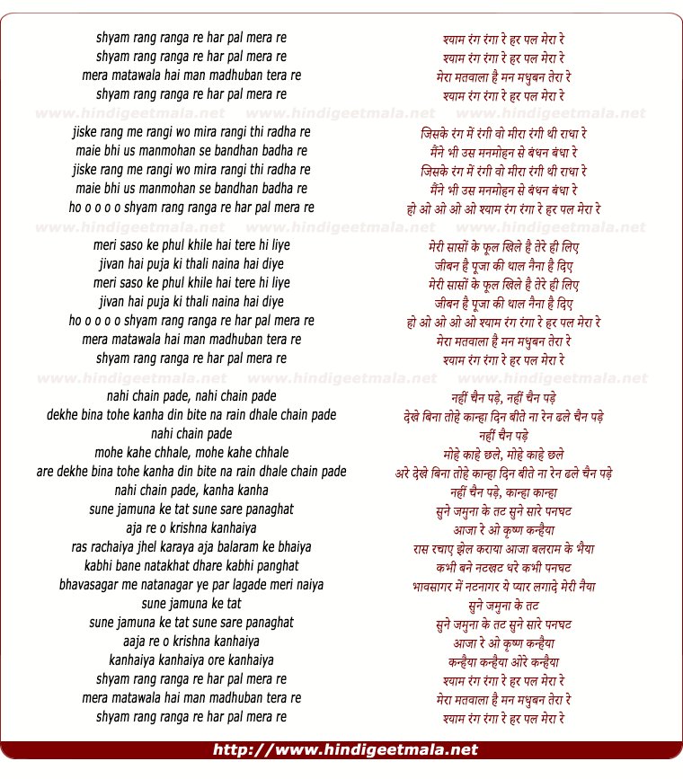 Lyrics of Shyaam Rang Rangaa Re Har Pal Meraa Re - श्याम रंग रंगा रे हर पल मेरा रे