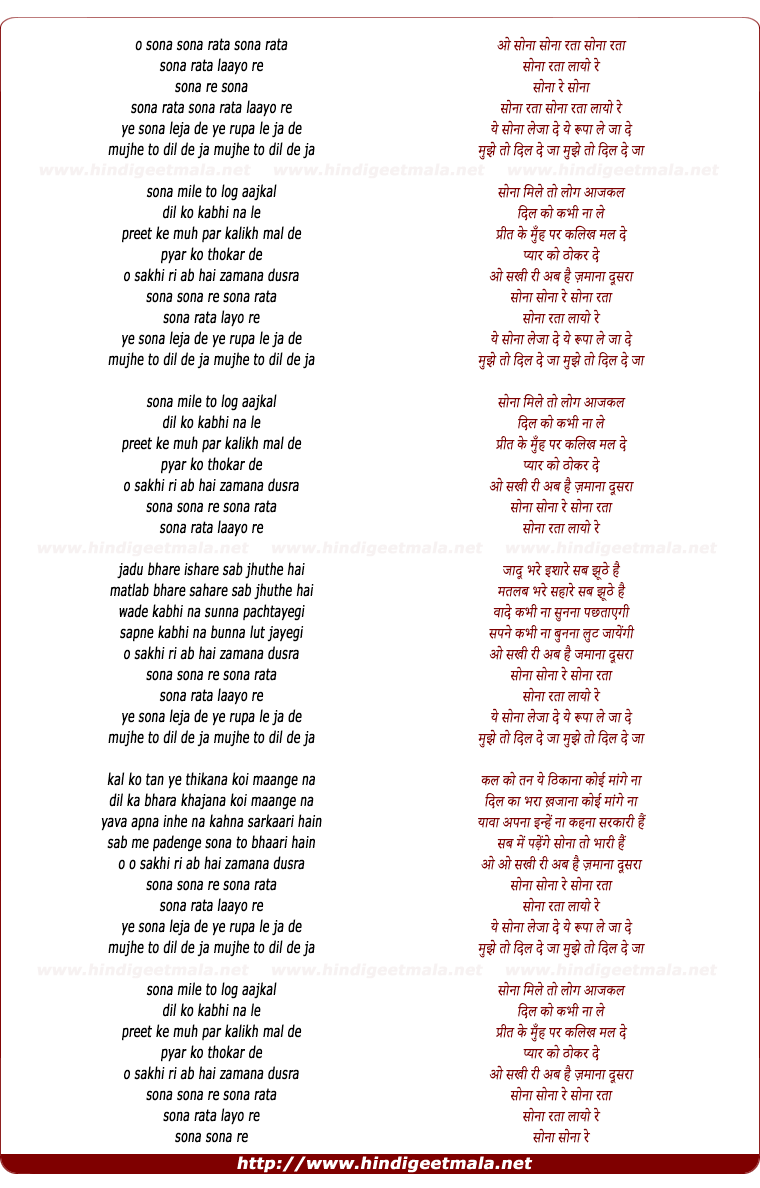 Lyrics of Sona Rupa Layo Re (Sona Sona Re) - सोना रूपा लायो रे ( सोना सोना रे )