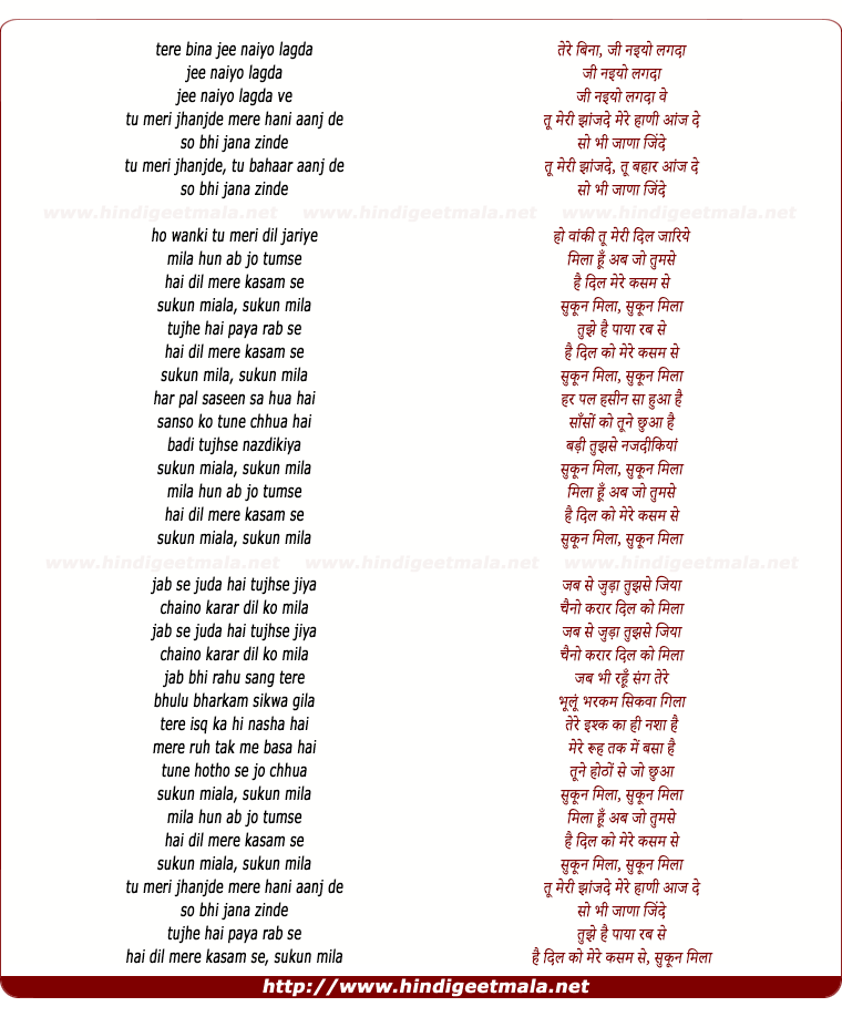 Lyrics of Sukoon Mila (Reloaded) - तेरे बिना, जी नइयो लगदा