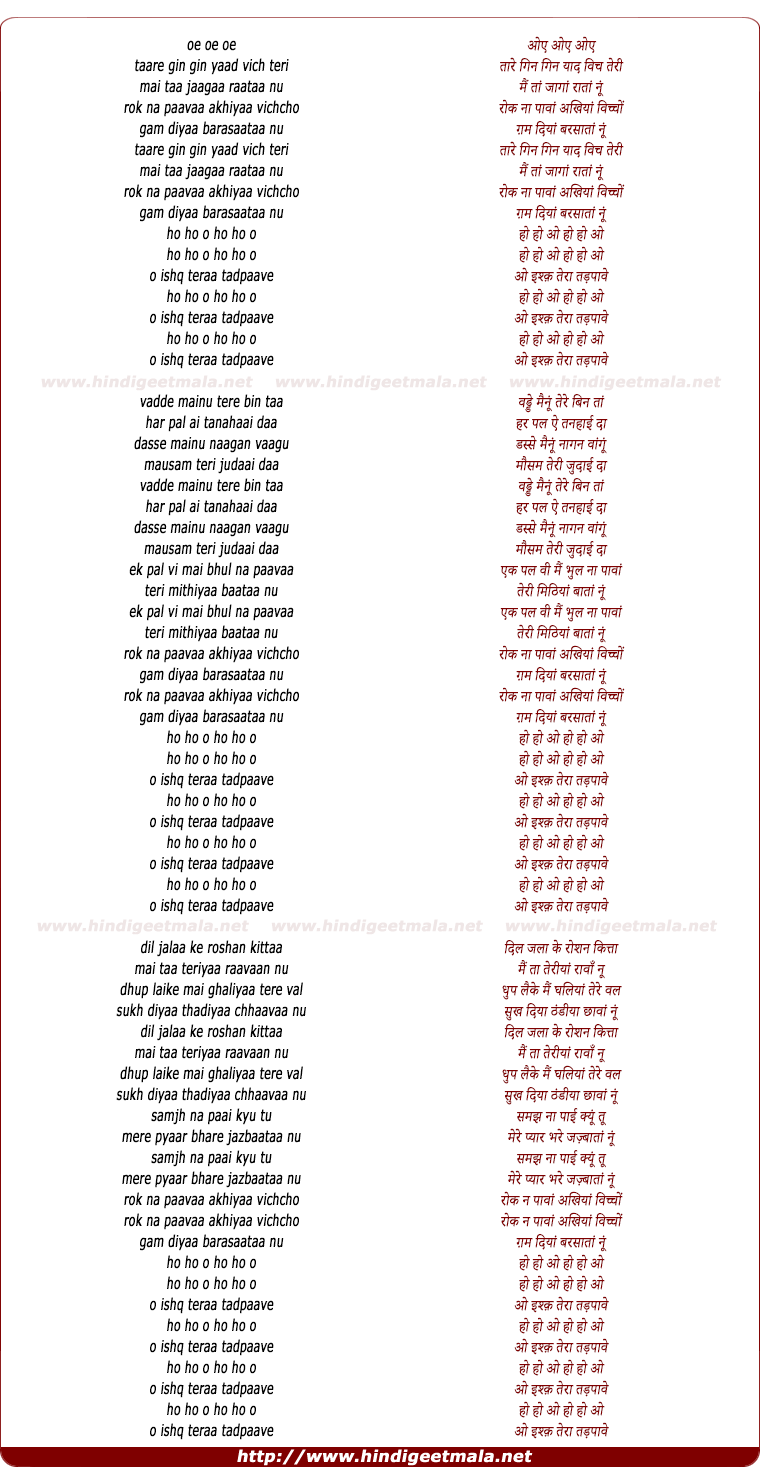 Comments for lyrics of song "Taare Gin Gin Yaad Vich Teri, Ishq Teraa Tadapaave"