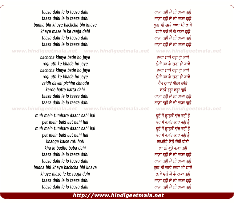 Lyrics of Taaza Dahi Le Lo Taaza Dahi, Taaza Dahi Le Lo (Female) - ताज़ा दही ले लो ताज़ा दहीtaaza dahi le lo taaza dahi