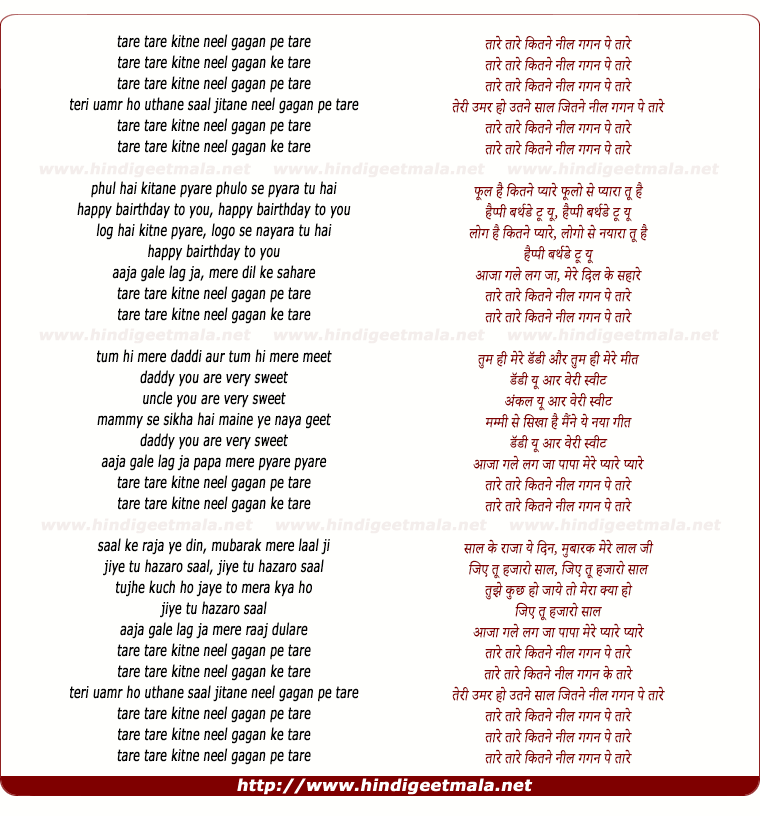 Lyrics of Tare Kitne Neel Gagan Pe Tare, Teri Umar Ho Itne Saal - तारे कितने नील गगन पे तारे, तेरी उम्र हो इतने साल