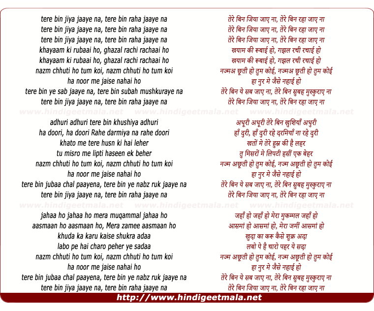 Comments for lyrics of song "Tere Bin Jiya Jaye Naa"