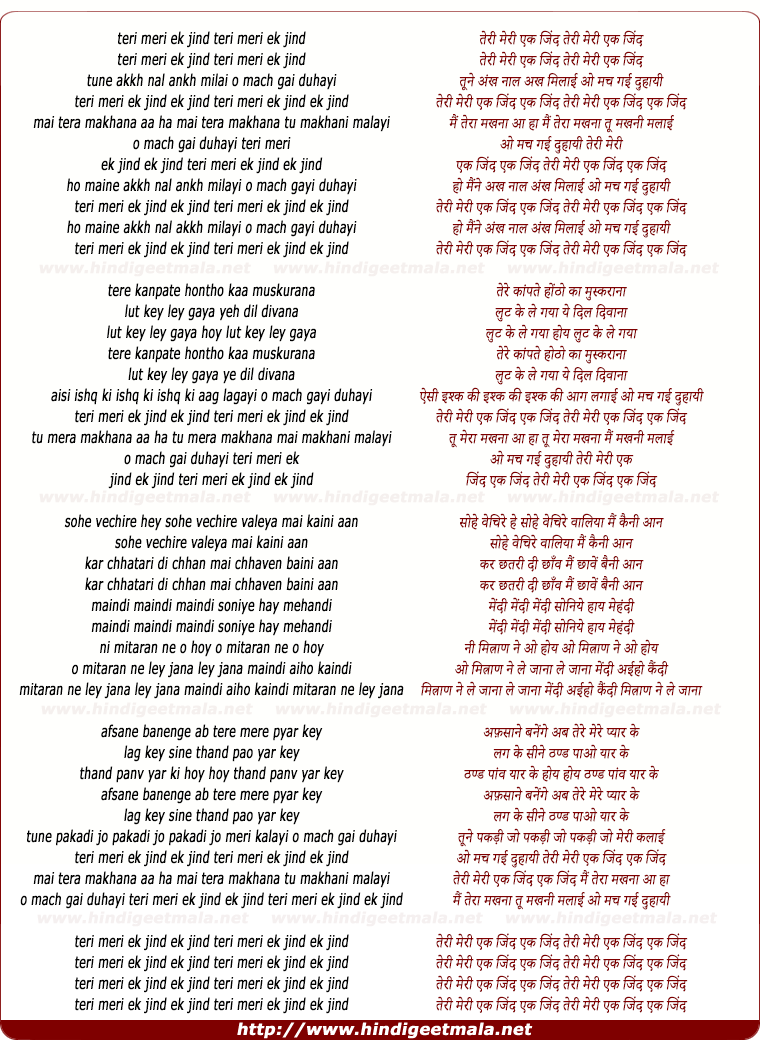 Lyrics of Teree Meree Ik Jind - तेरी मेरी एक जिंद