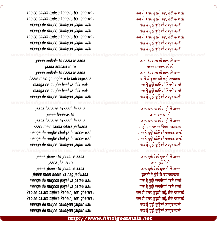 Lyrics of Teri Gharwali - कब से बलम तुझसे कहें, तेरी घरवालीkab se balam tujhse kahein, teri gharwali