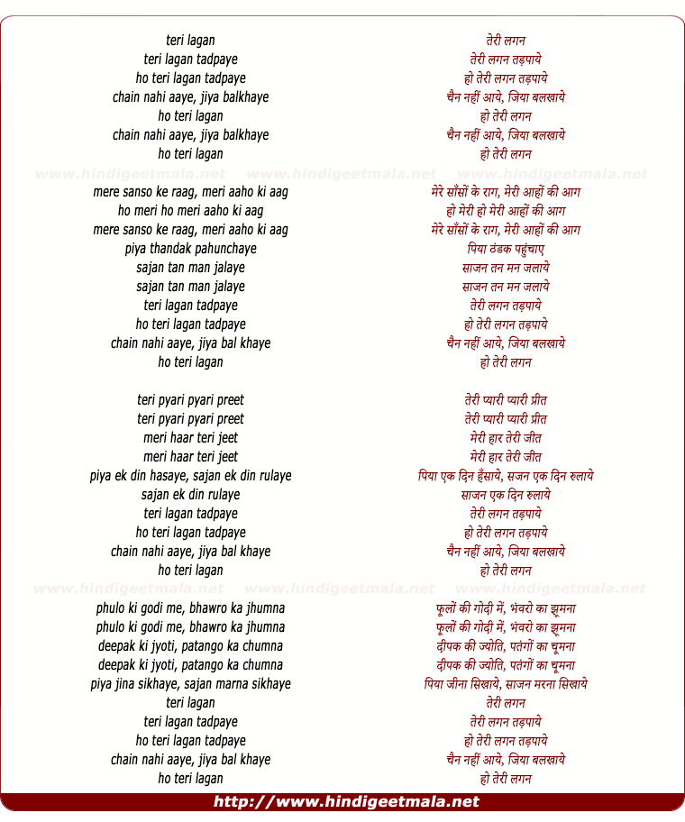 Lyrics of Teri Lagan Tadpaye Chain Nahi Aaye - तेरी लगन तड़पाये चैन नहीं आये teri lagan
