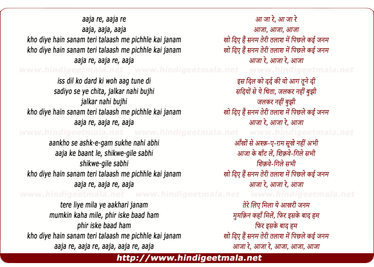 Lyrics of Kho Diye Hain Sanam Teri Talaash Me Pichhle Kai Janam - खो दिए हैं सनम तेरी तलाश में पिछले कई जन्मaaja re, aaja re