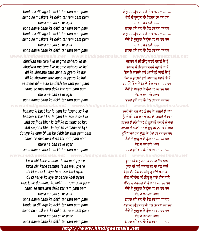 Lyrics of Thodaa Saa Dil Lagaa Ke Dekh, Tar Ram Pam Pam - थोड़ा सा दिल लगा के देख, तर रम पम पम