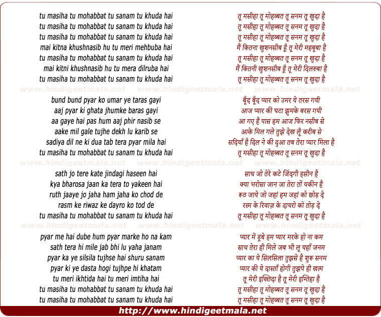 Lyrics of To Massiah Tu Mohabbat Tu Sanam - तू मसीहा तू मोहब्बत तू सनम