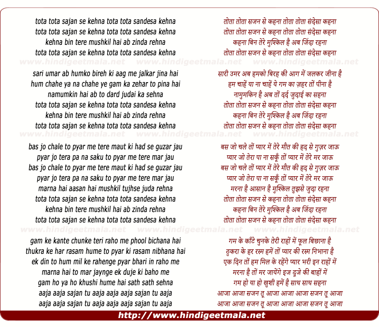 tota tota sajan se kehna tota tota sandesa kehna