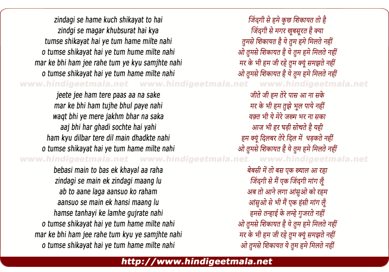 Lyrics of Tumse Shikaayat - तुमसे शिकायत