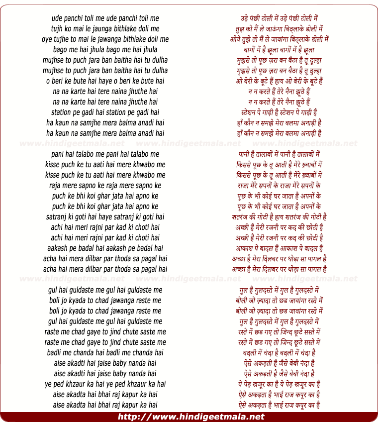 Lyrics of Ude Panchi Toli Me, Tujh Ko Mai Le Jaunga Bithlake Doli Me - उड़े पंछी टोली में, तुझ को मैं ले जाऊंगा बिठ्लाके डोली में