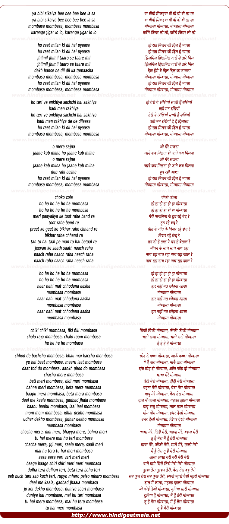 Lyrics of Yaa Bibi Sikaiyaa, Mombaasaa, Ho Raat Milan Ki - या बीबी सिकइया, मोम्बासा, हो मिलन की