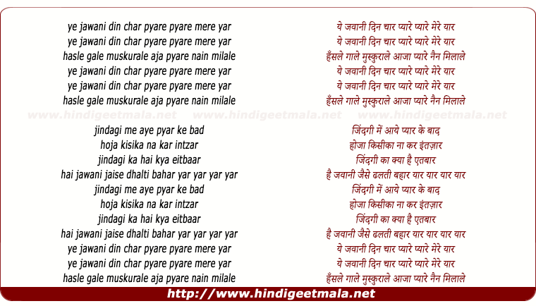 Lyrics of Yeh Jawani Din Char, Pyare Pyare Mere Yaar - ये जवानी दिन चार, प्यारे प्यारे मेरे यार