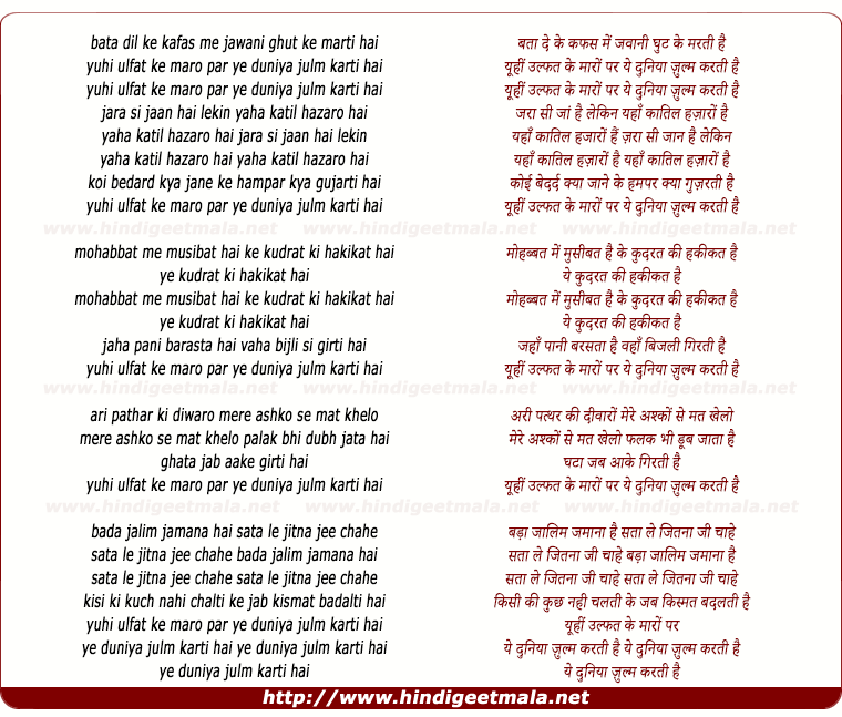 Lyrics of Yu Hi Ulfat Ke Maro Par Ye Duniya Julm Karti Hai - यूँ ही उल्फत के मारों पर ये दुनिया ज़ुल्म करती है