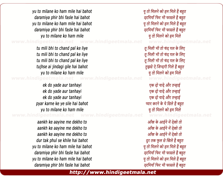 Lyrics of Yu Toh Milane Ko Ham Mile Hain Bahot - यू तो मिलने को हम मिले है बहुत