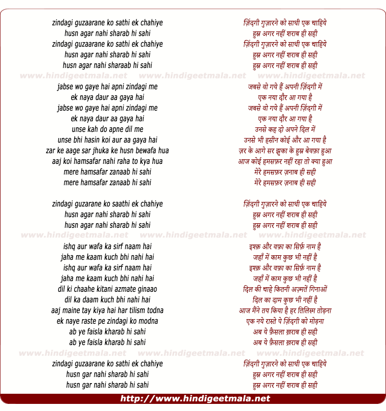 Lyrics of Zindagi Guzaarane Ko - ज़िंदगी गुज़ारने कोzindagi guzaarane ko sathi ek chahiye