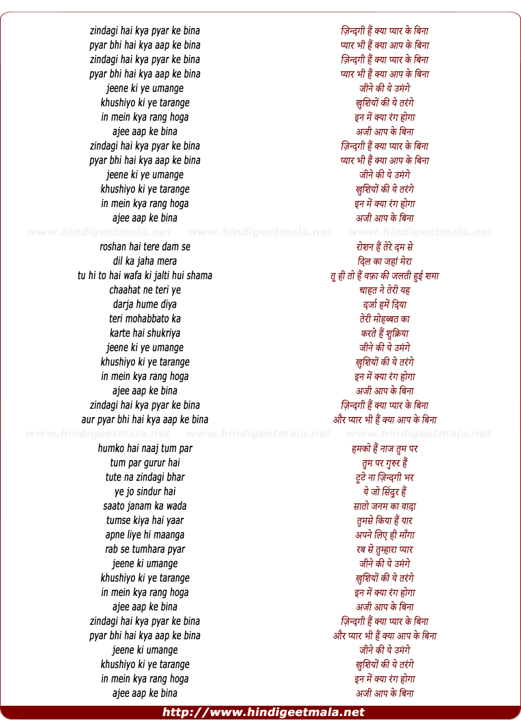 Lyrics of Zindagi Hai Kya Pyar Ke Bina - ज़िन्दगी हैं क्या प्यार के बिना